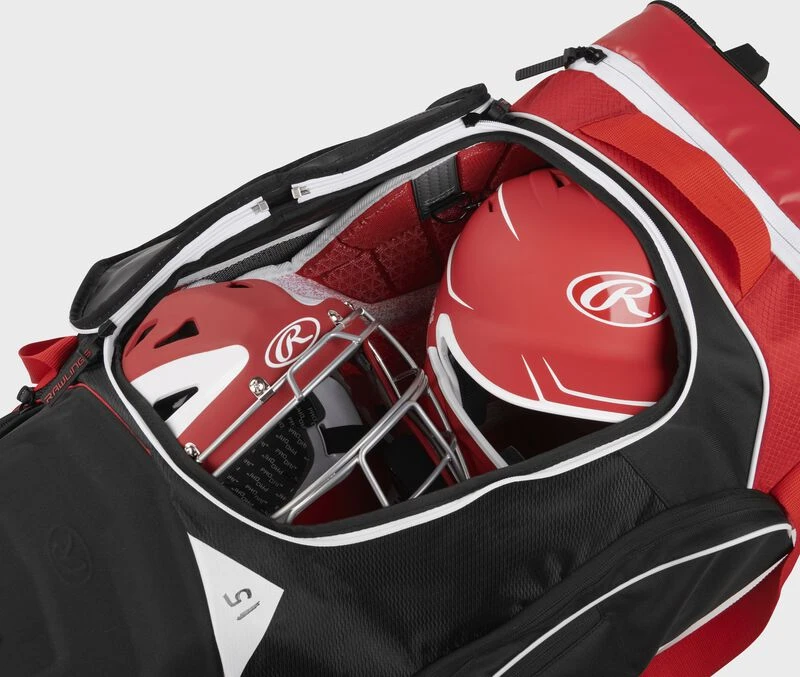 This wheeled catcher’s bag is extremely versatile, and perfect for carrying all your gear to the game. It features a main storage compartment for your catcher’s gear and helmet, as well as a separate, hard molded pocket to keep your glove protected, and can hold up to four (4) bats. Its full bottom rails with rugged, durable wheels along with reinforced hand and shoulder straps make this bag ready to stand the test of time.